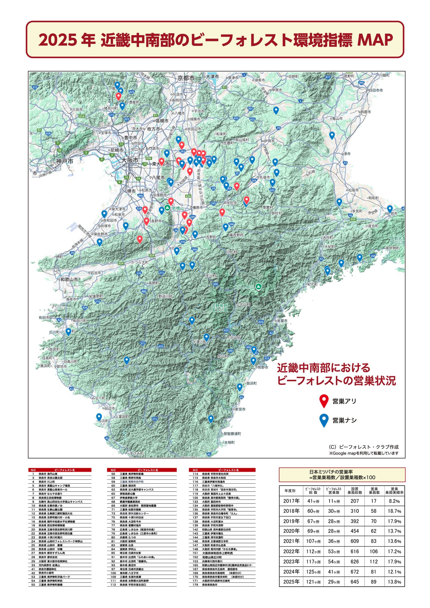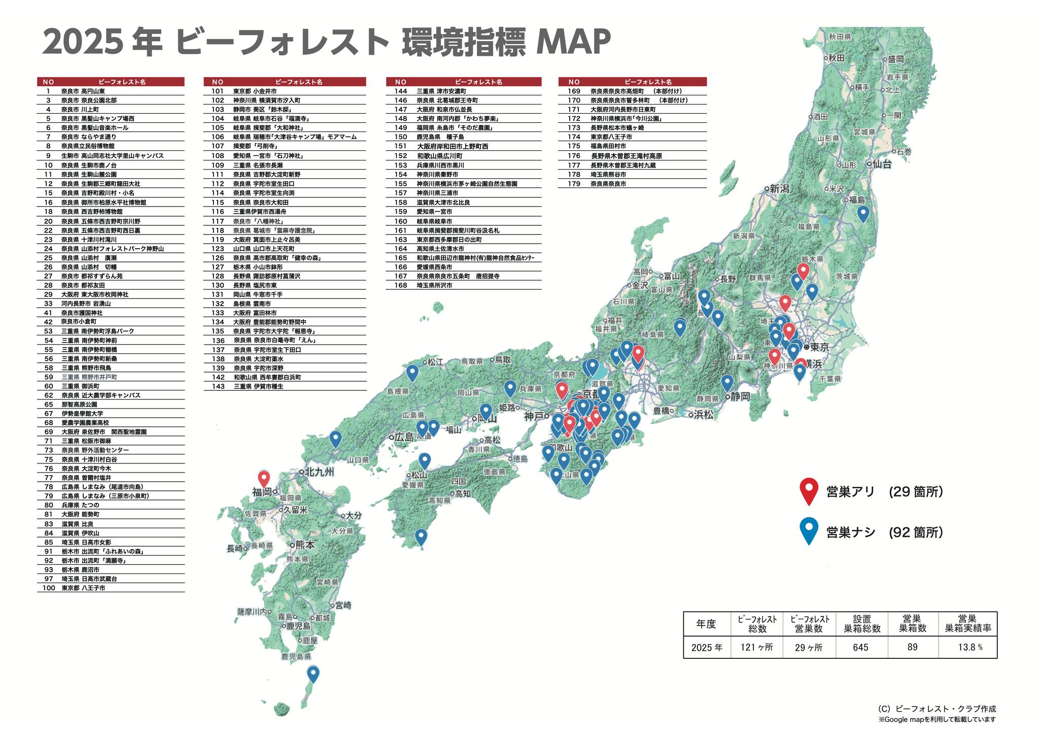 ビーフォレスト環境指標MAPとは、日本ミツバチの生息状況を見える化した地図です。 全国のビーフォレスター仲間の定期的な巣箱モニタリングを基に、天気図のように日本ミツバチの生息変化を見える化しています。そして、各ビーフォレスト周辺の植生環境調査も進めて、自然環境との関連性を調査しながら、「花バチ」を中心とした生物多様性や生態系が機能する森づくりを進めています。